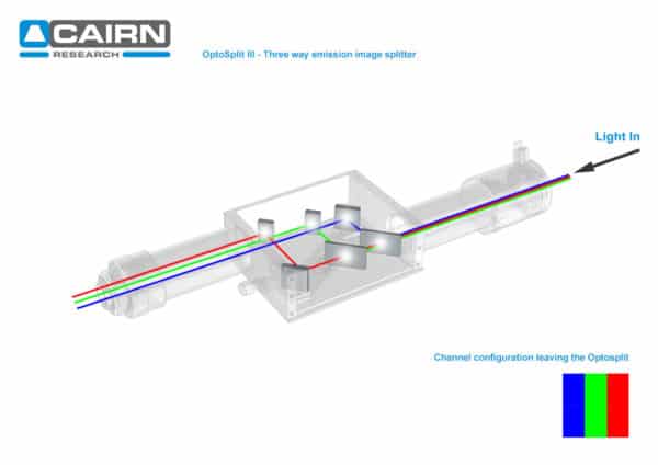 Splitting is usually performed on the basis of wavelength or polarisation, allowing applications where there is a requirement for simultaneous, or high speed, acquisition of multiple emission bands or polarisations states. The simultaneous acquisition of up to three images offers a major benefit over manual or electronic filter changers, as there is no longer a need to pause acquisition while the filter position is changed. This allows your camera to be operated in fast stream modes.